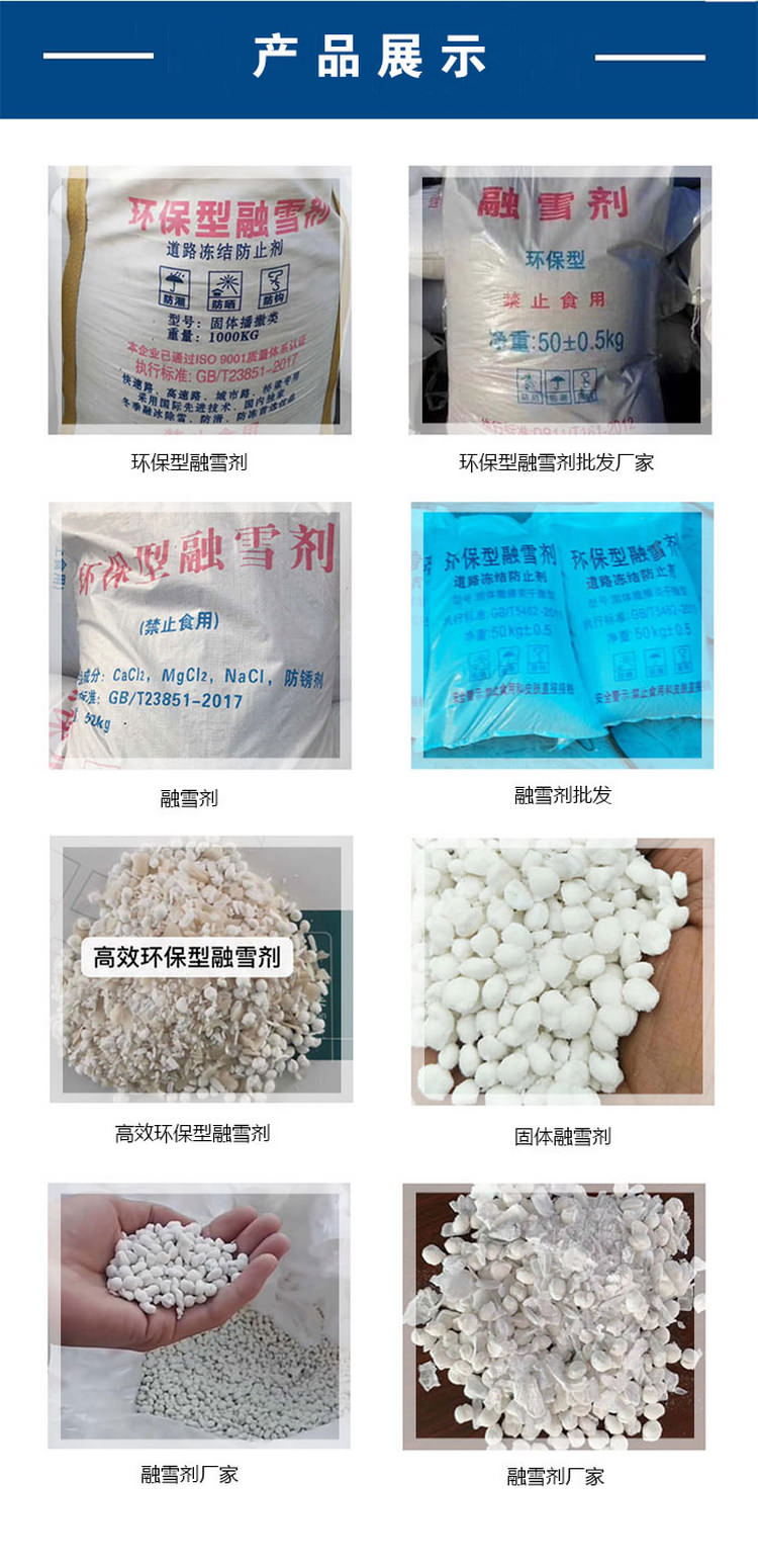 在公路,橋梁,金屬設施,路面,地面建筑棚架,工廠,學校,醫院,停車場等地方清除積雪和結冰。融雪不傷害物體,不污染環境,是一種高效環保物質。