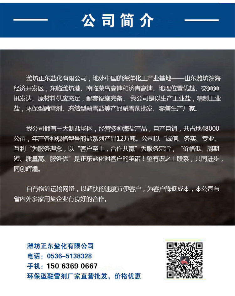 濰坊正東鹽化有限公司,地處中國的海洋化工產業基地——山東濰坊濱海經濟開發區,東臨濰坊港、南臨榮烏高速和濟青高速、地理位置優越、交通通訊發達、原材料供應充足,配套設施完備。 我公司是以生產工業鹽,日曬鹽,軟水鹽,精制工業鹽,飼料添加劑氯化鈉,凍結型融雪鹽等產品工業鹽批發生產廠家。